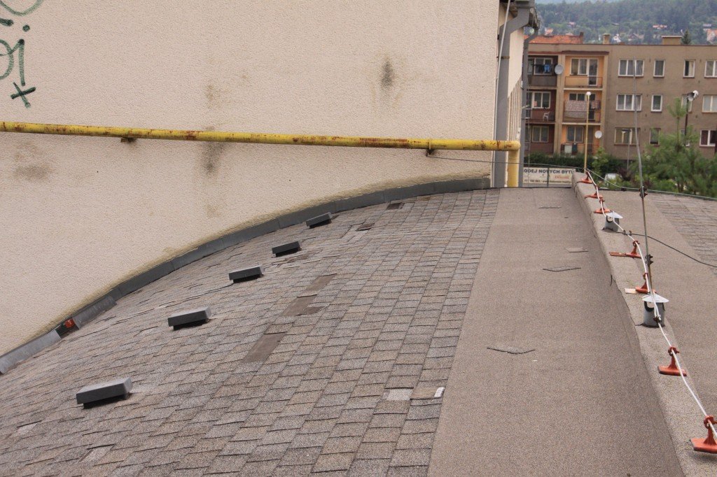 Šindele jsou ale pro válcový tvar konstrukce nevhodné. Ve vrchní části přístavby jsou osazeny takřka vodorovně, to je ale v rozporu s předpisy pro tuto krytinu. Ve vodorovných částech střechy dochází k prosakování vody do prken vytvářejících tvar konstrukce.